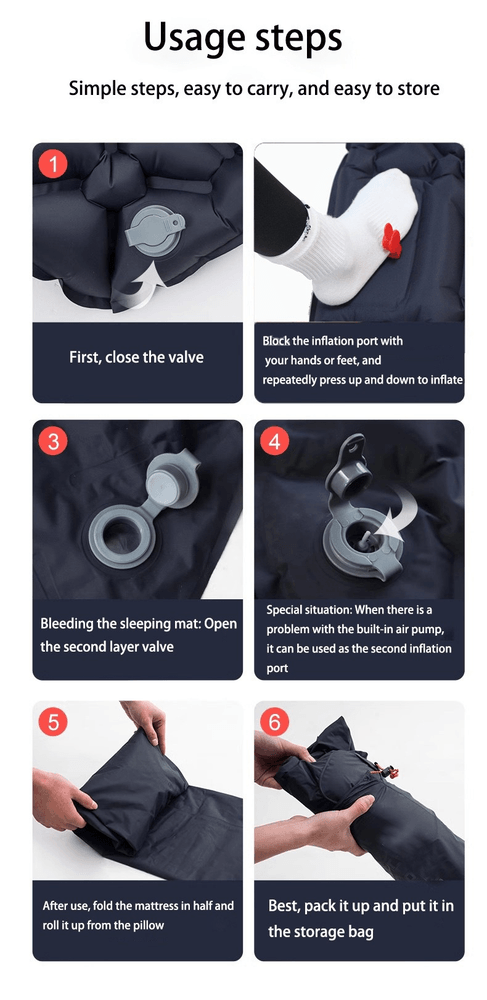 - 🏜️🏜️ONLY 50s STOMP TO INFLATE & 1S DEFLATE- 2022 upgraded foot press sleeping pad, NO MORE inflating by your mouth, hands or carry a pump, just simply stomp on intake device at the bottom of the sleeping pad for only 30 seconds to inflate. Look, perfect camping mat, start your adventure. The newest single-layer air release valve design, just open the deflation plug, only need 1sec to achieve super quick to deflate.
